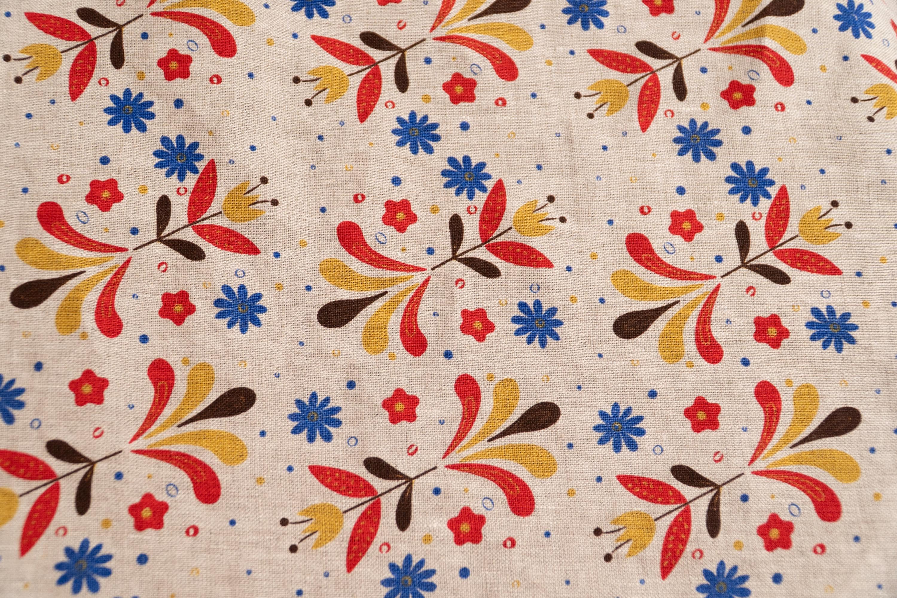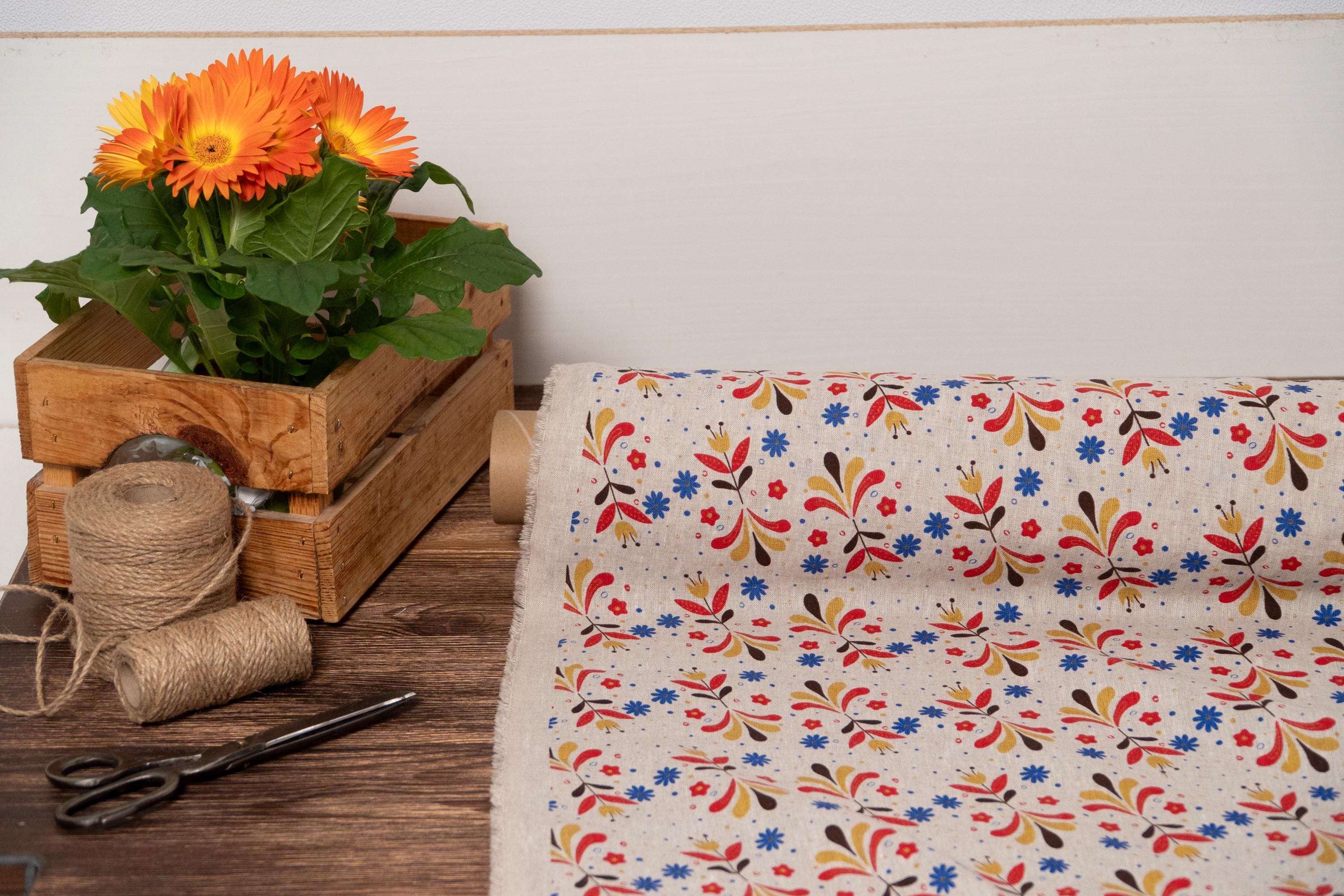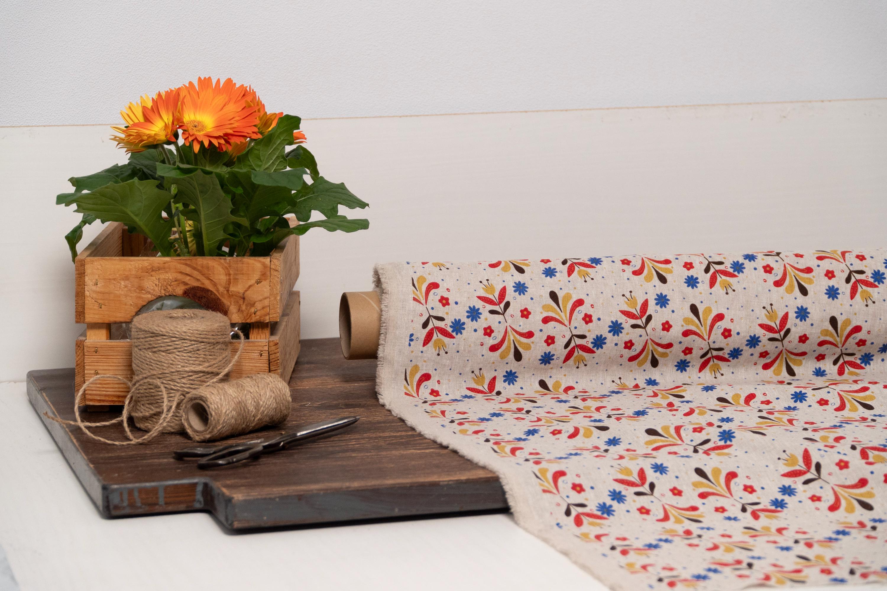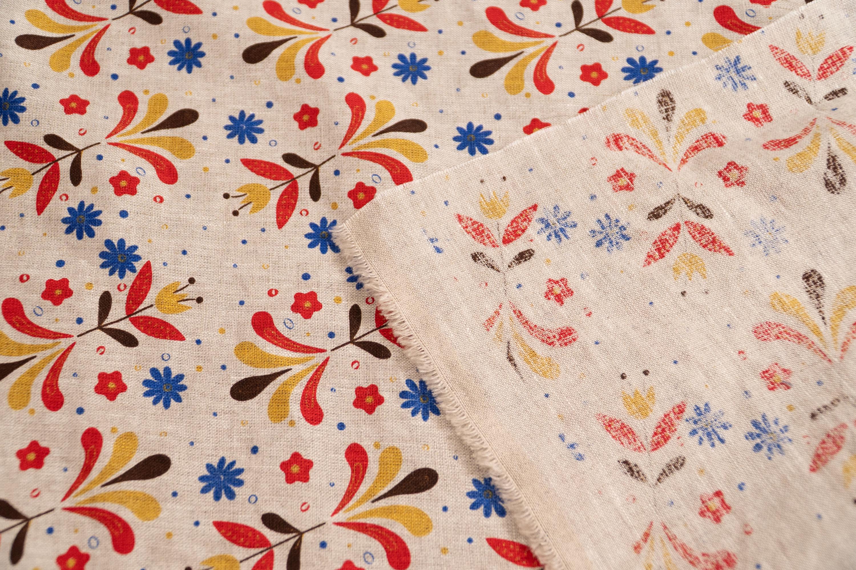 Natural undyed linen fabric with printed floral folk by meter or yards. Medium weight 6.05 oz/yd² / 205 g/m² linen fabric. This fabric is perfect for sewing clothing, table linen, bed linen, curtains and other various interior decorations.