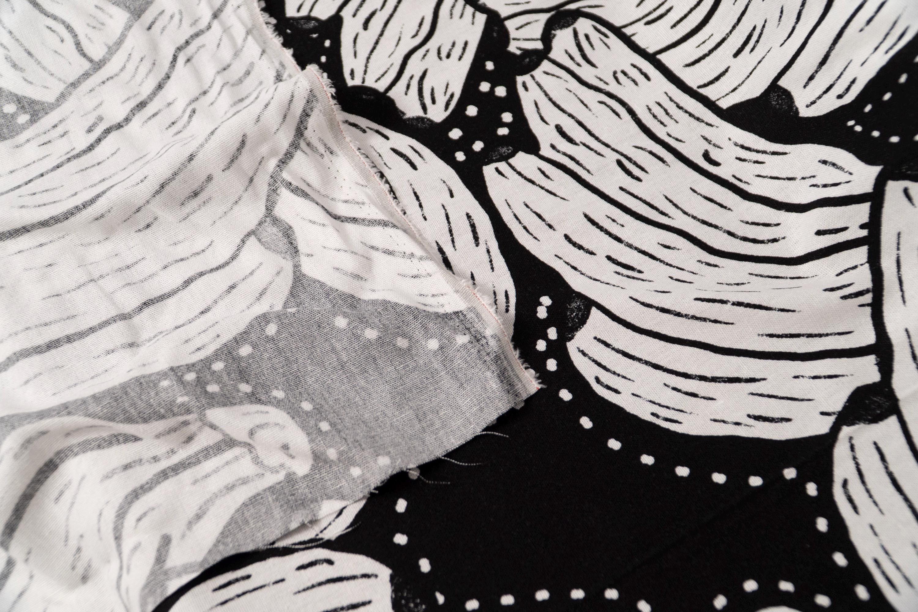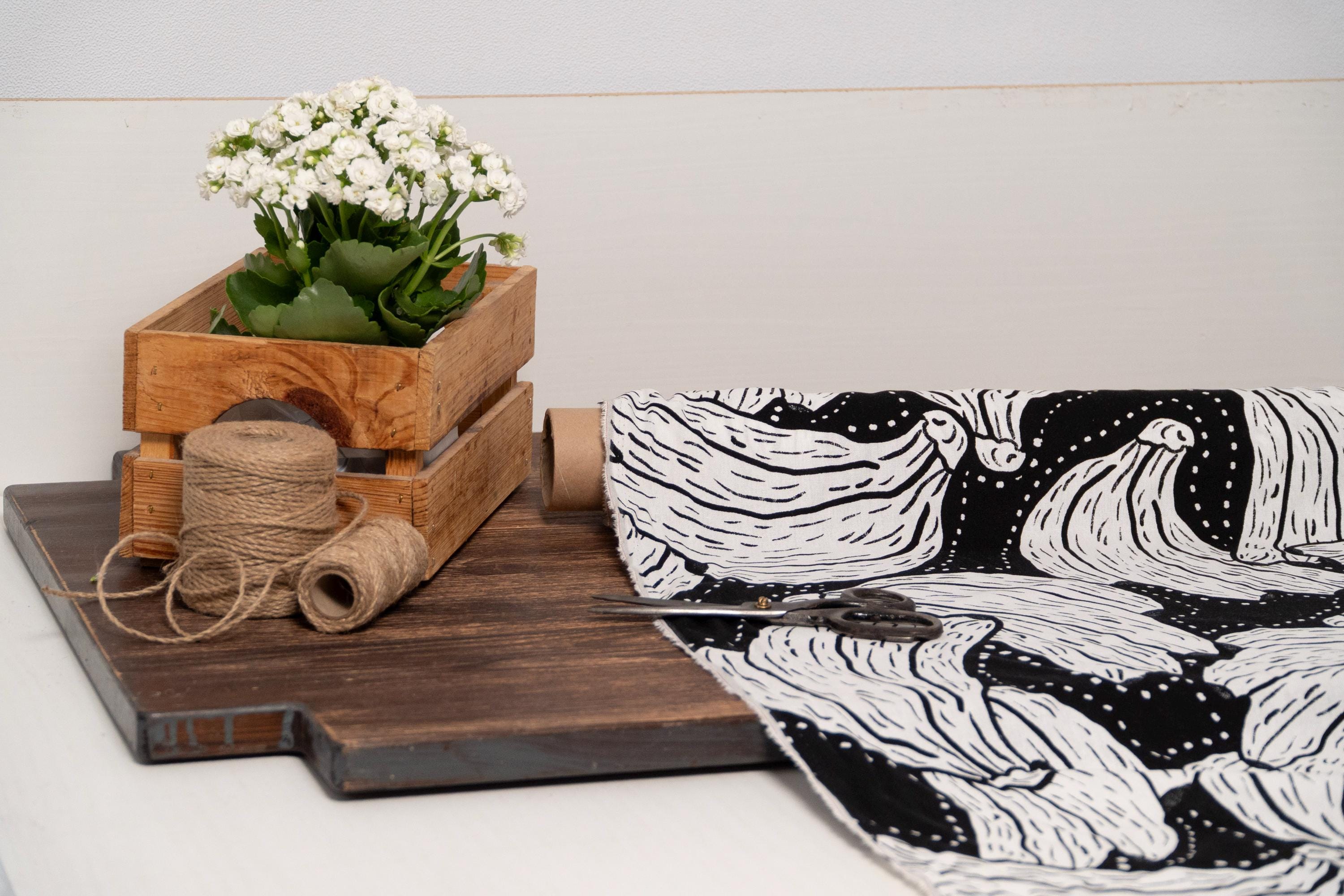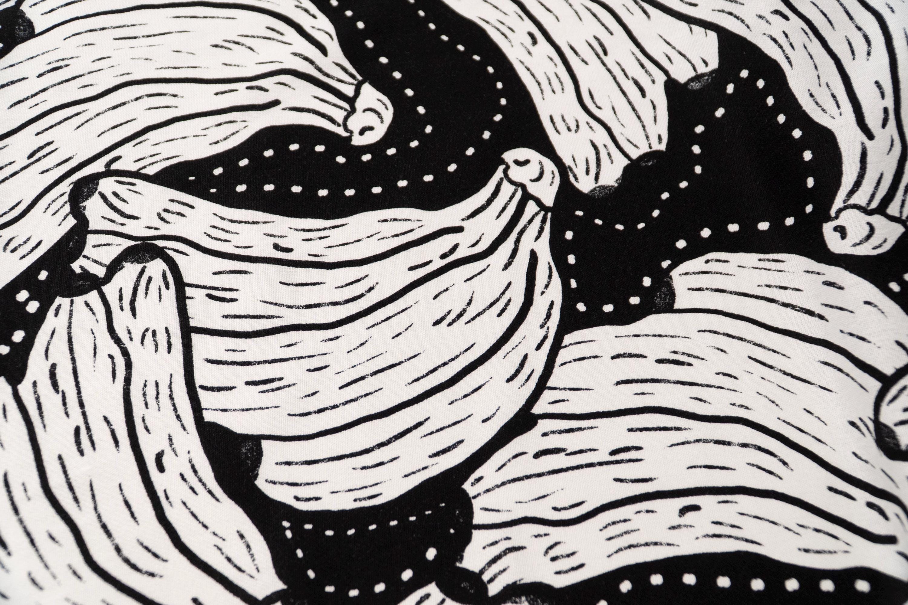 Black with white banana printed linen blend fabric by meters or yards. Medium weight 5.01 oz/yd² / 170 g/m² linen fabric. This fabric is perfect for sewing clothing, table linen, bed linen, curtains and other various interior decorations.