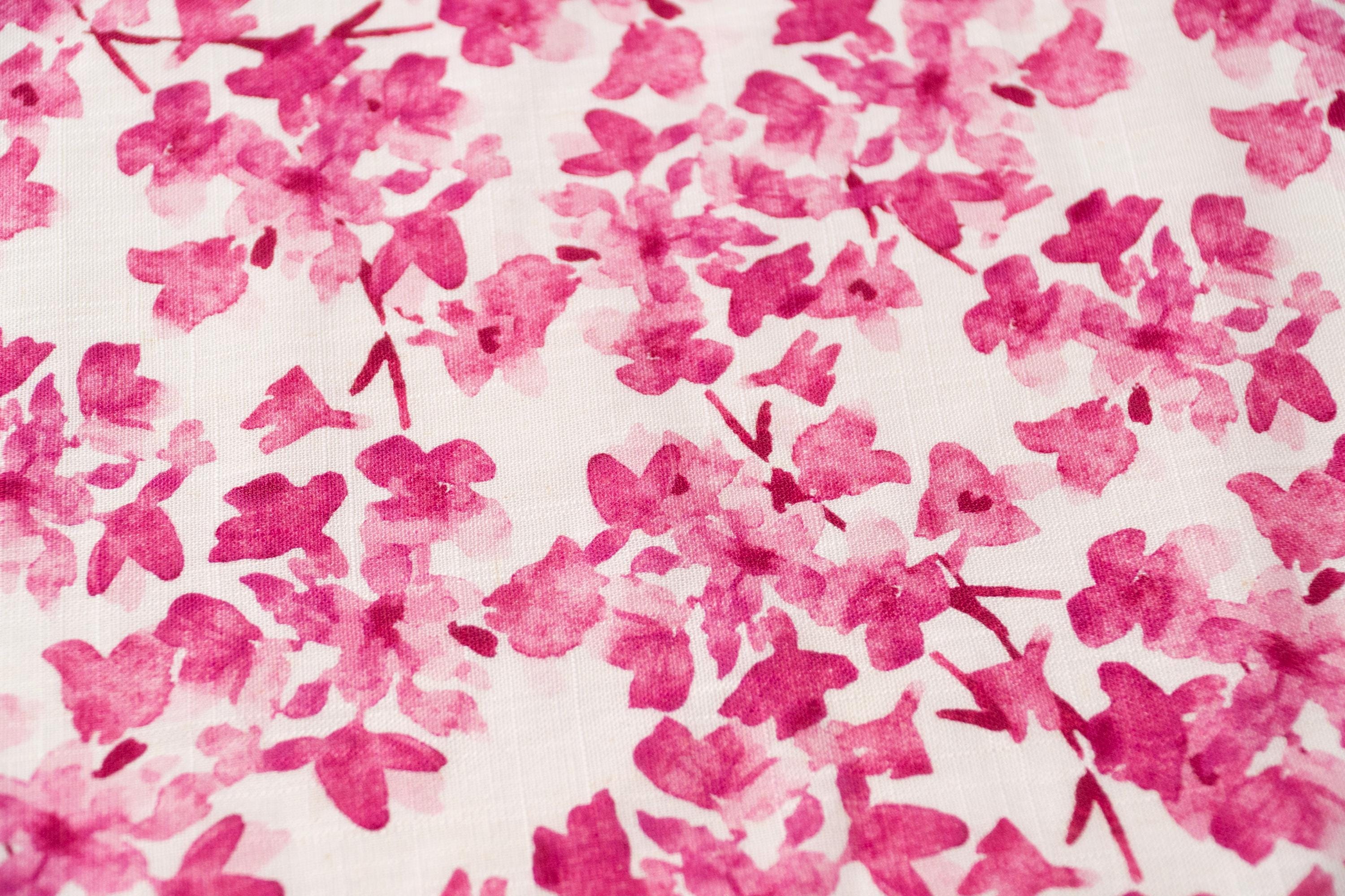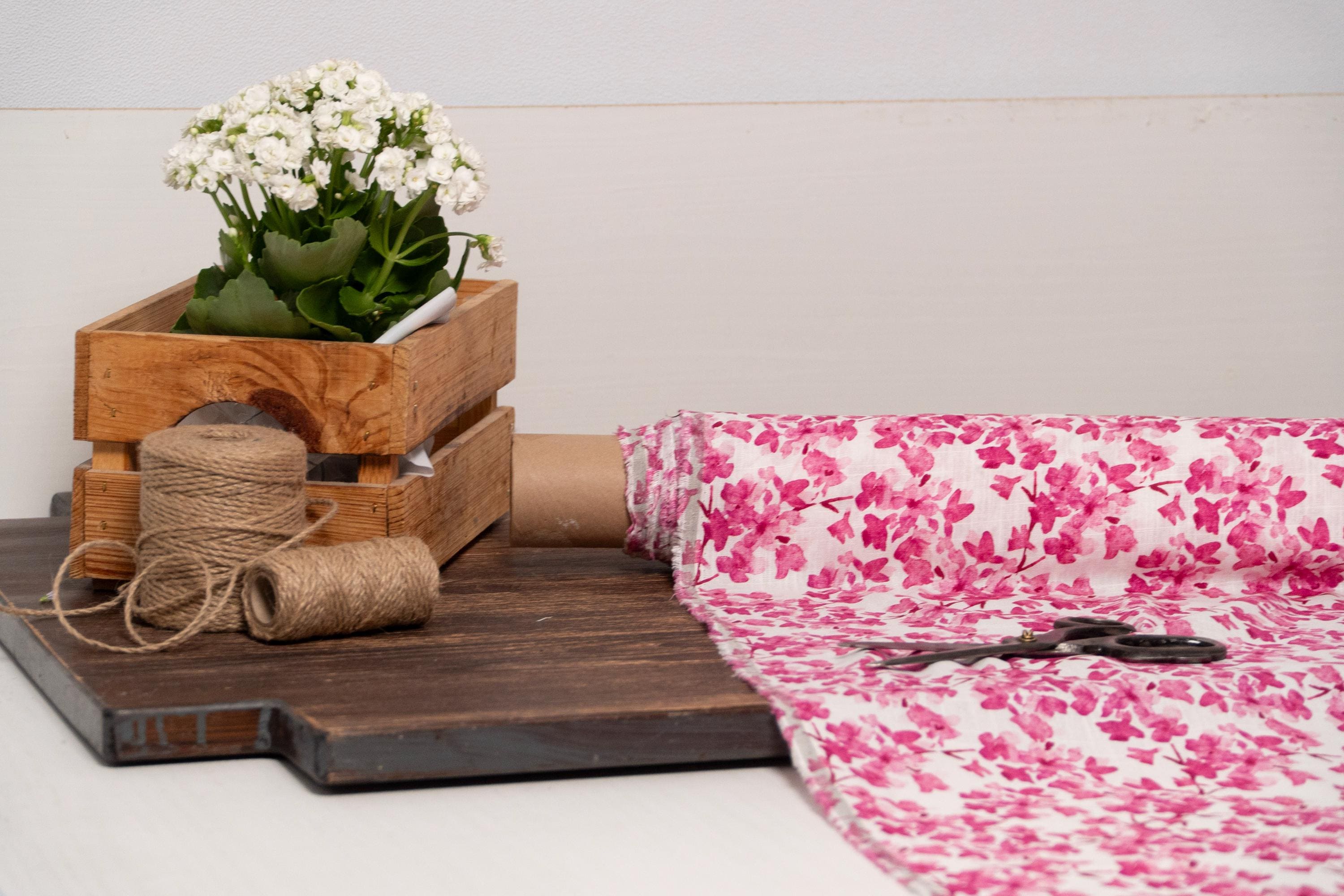 White with pink floral prints linen blend fabric by meters or yards. Medium weight 5.01 oz/yd² / 170 g/m² linen fabric. This fabric is perfect for sewing clothing, table linen, bed linen, curtains and other various interior decorations.