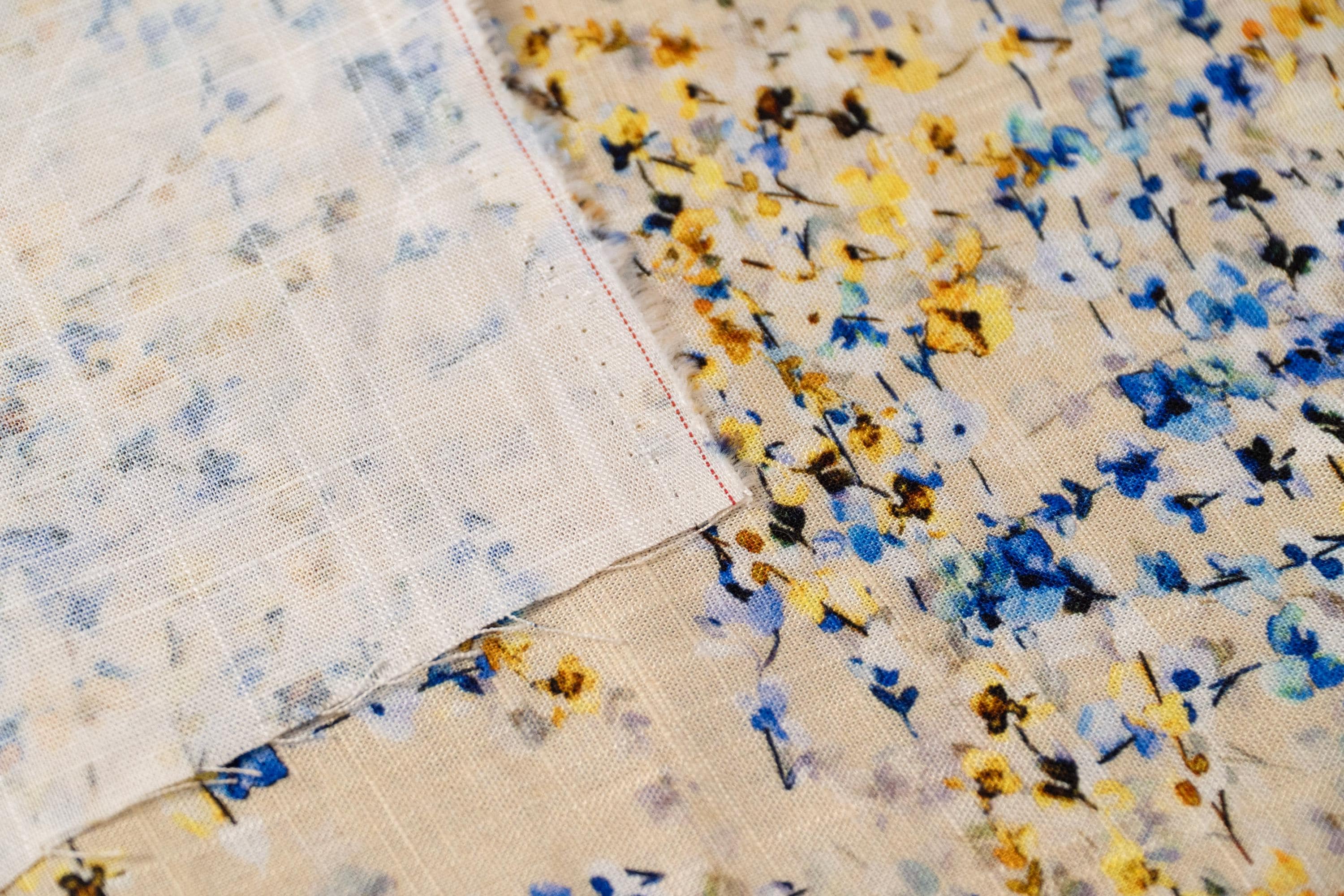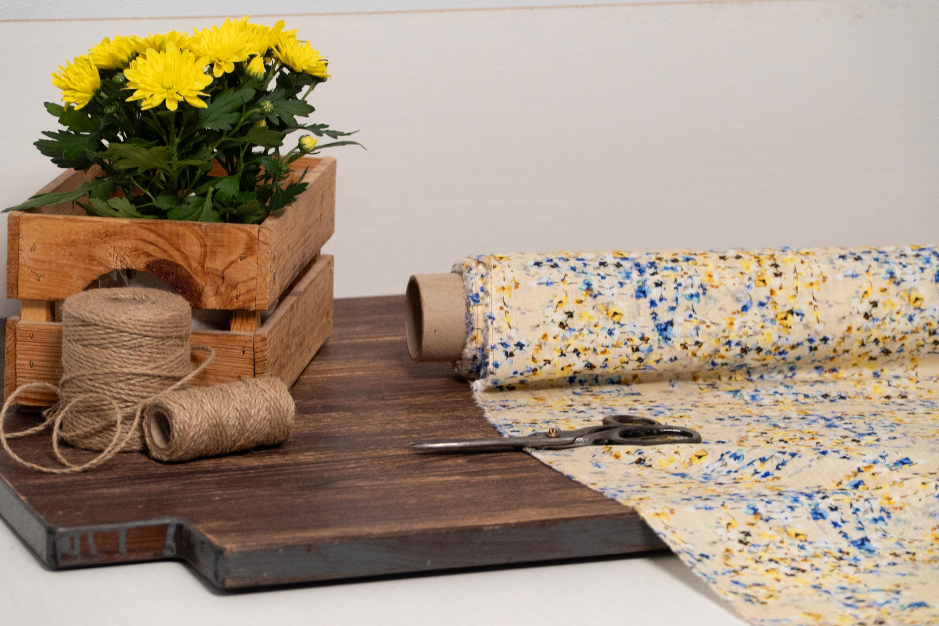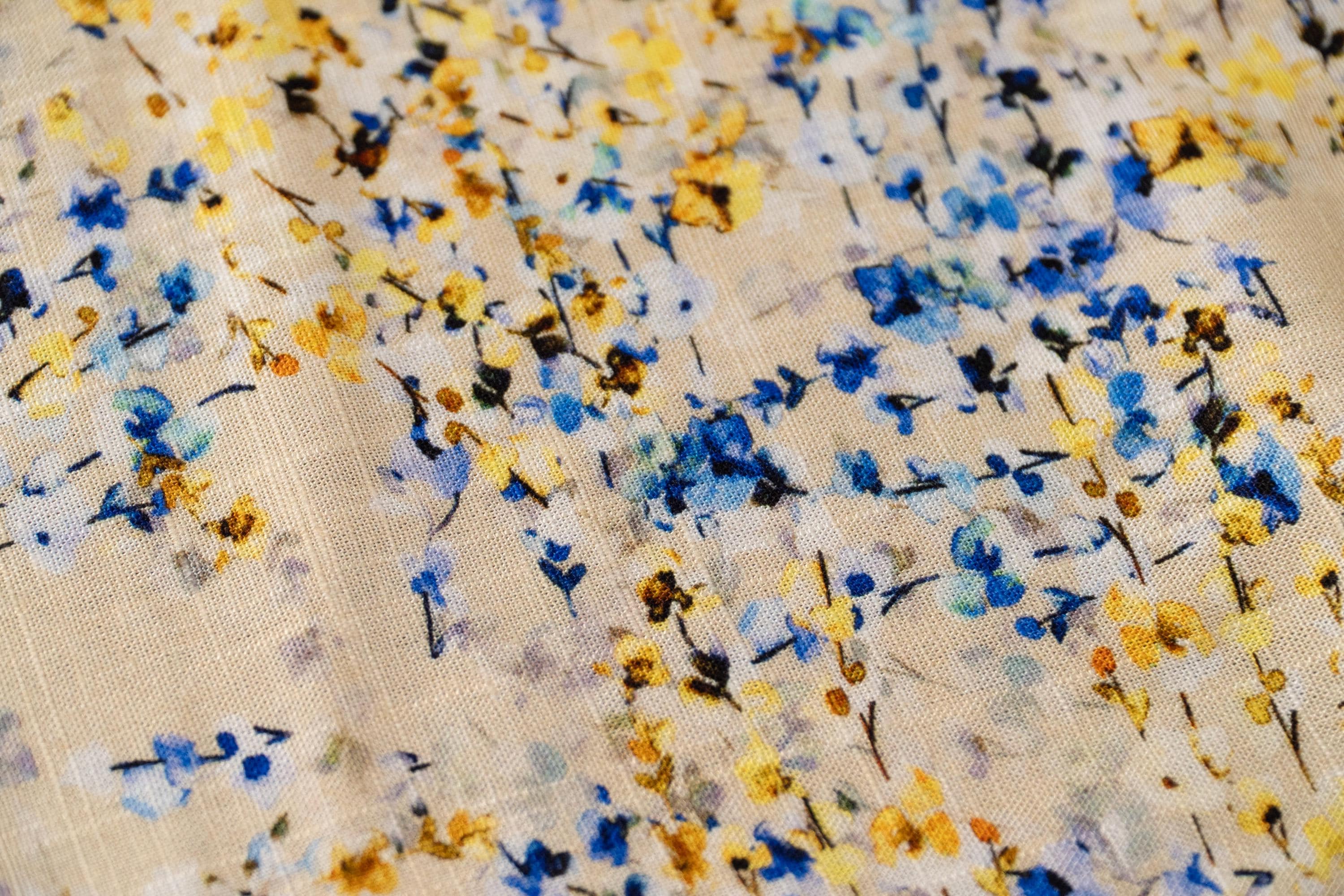 - Color: Blue and yellow floral printed blend linen fabric