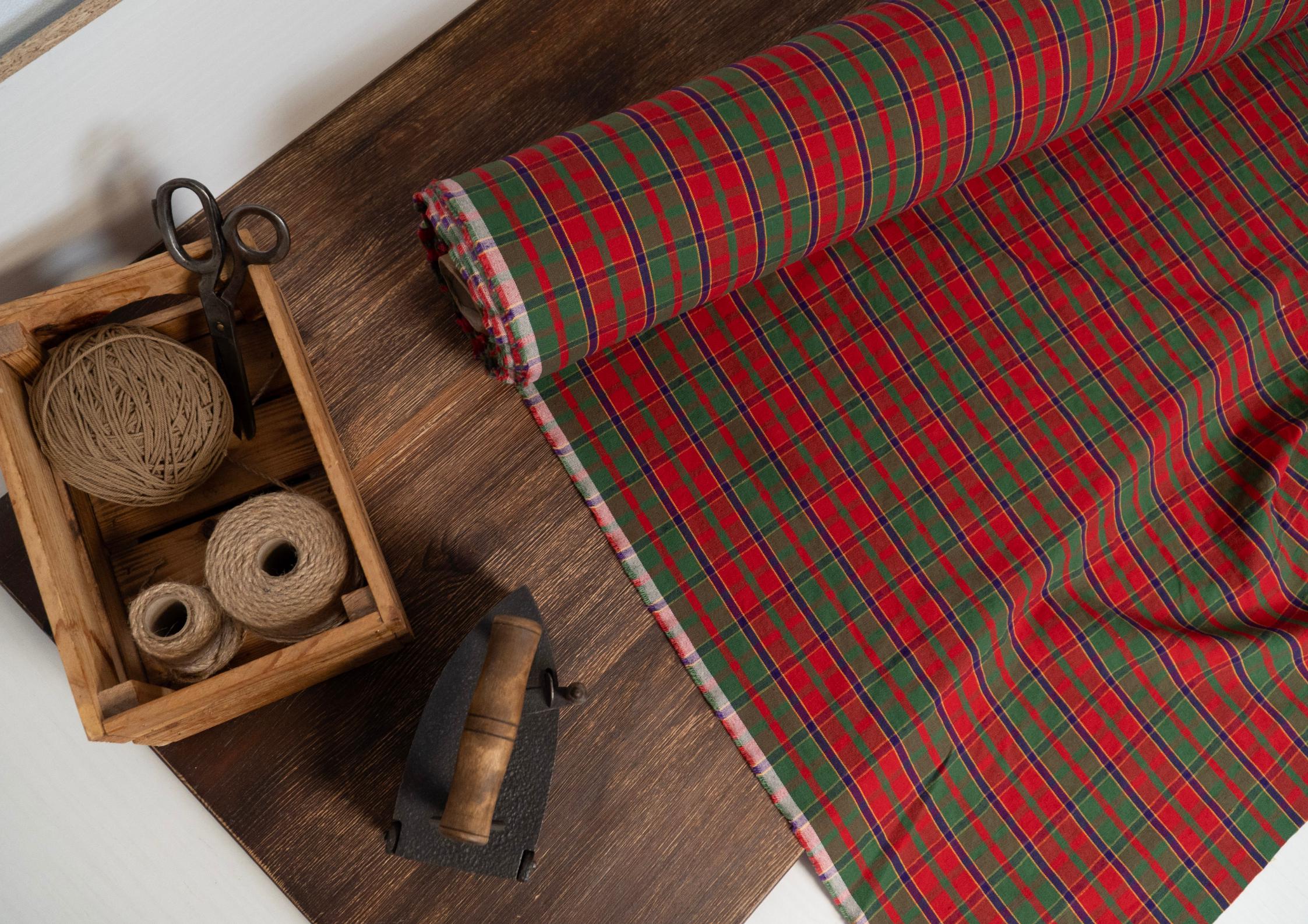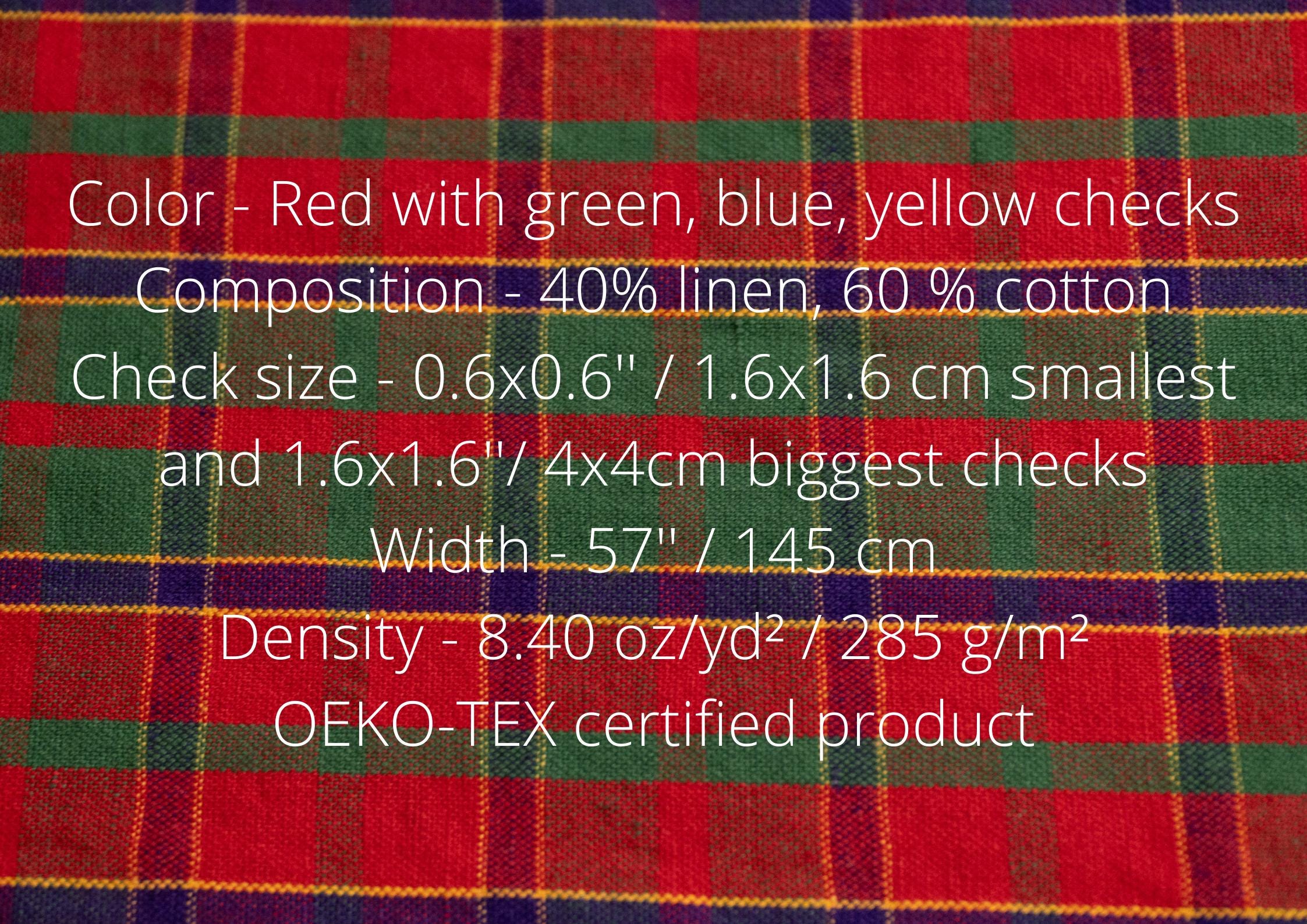 Red with green, blue , yellow checks linen and cotton blend fabric by meters or yards. Heavy weight 8.40 oz/yd² / 285 g/m² linen fabric. This fabric is perfect for sewing clothing, table linen, vests, folk clothing, skirts and other various interior decorations.
