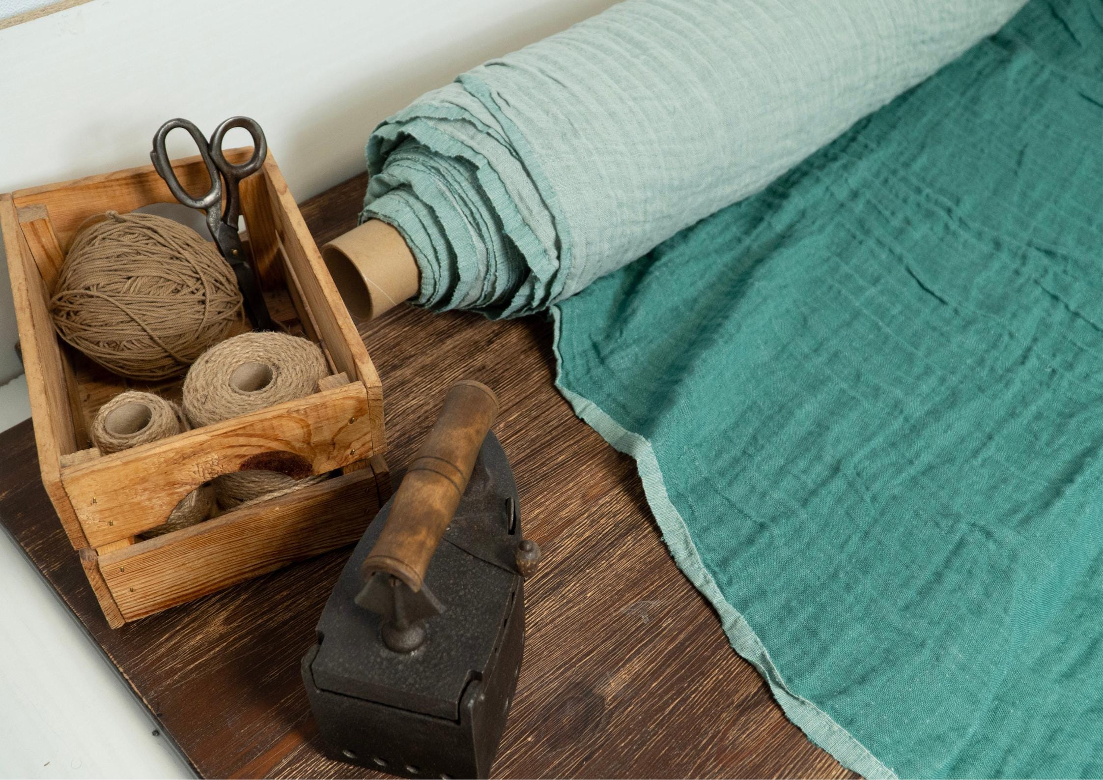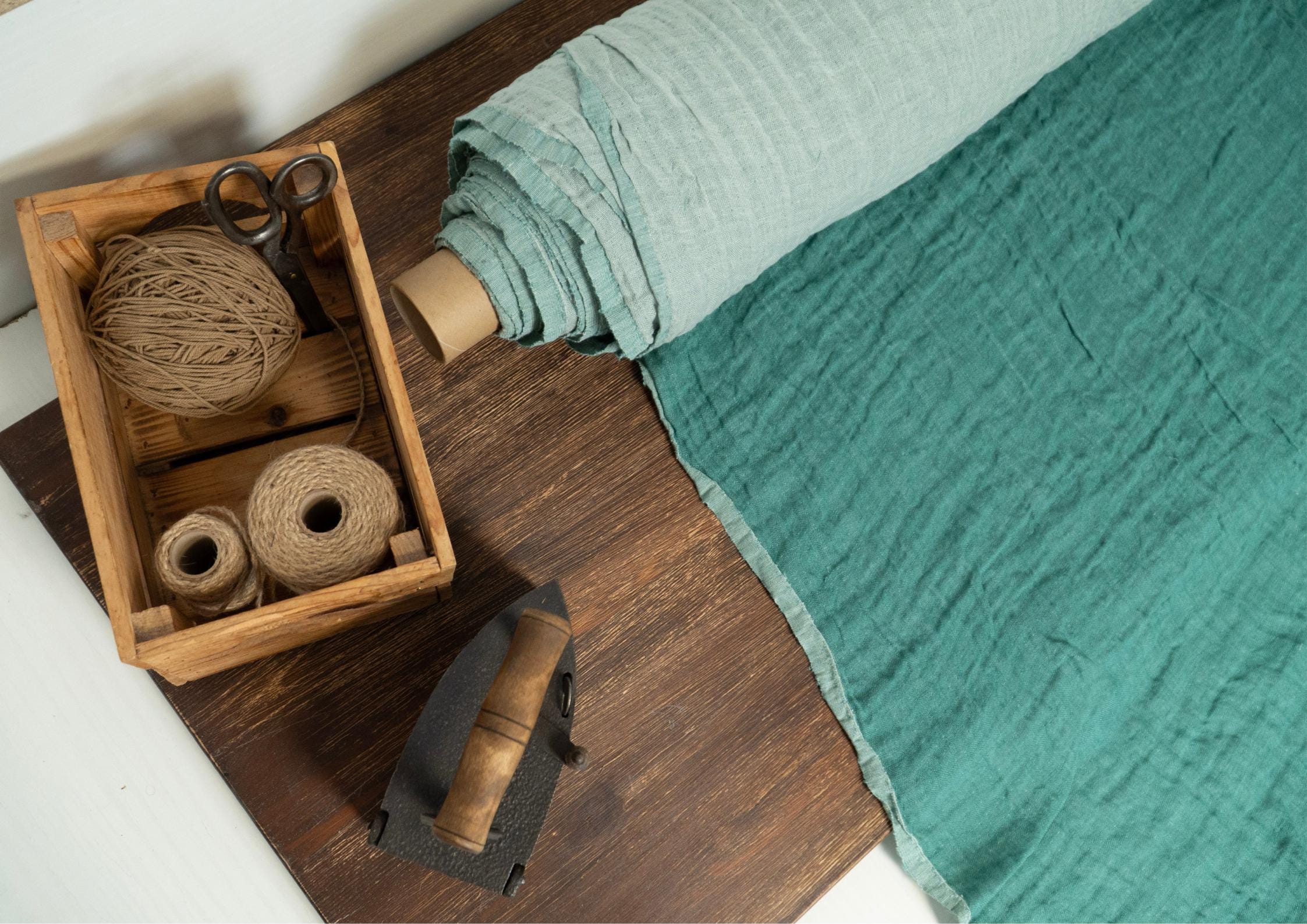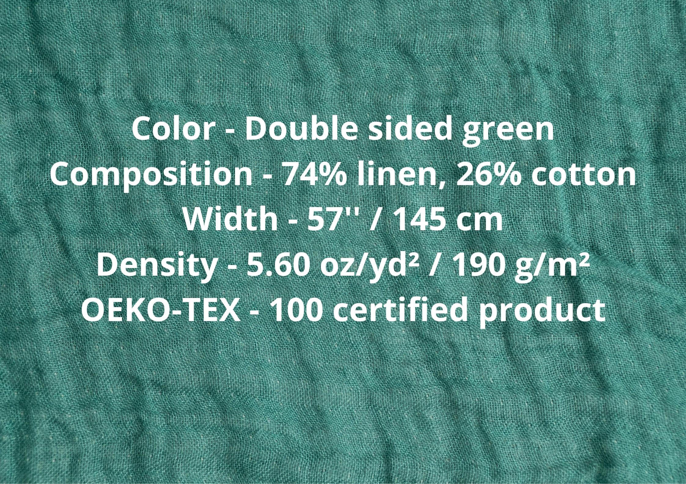 Double sided green linen cotton fabric by meters or yards. Medium weight 5.60 oz/yd² / 190 g/m² fabric. This soft washed fabric is perfect for sewing clothing, curtains, bedding and various interior projects.